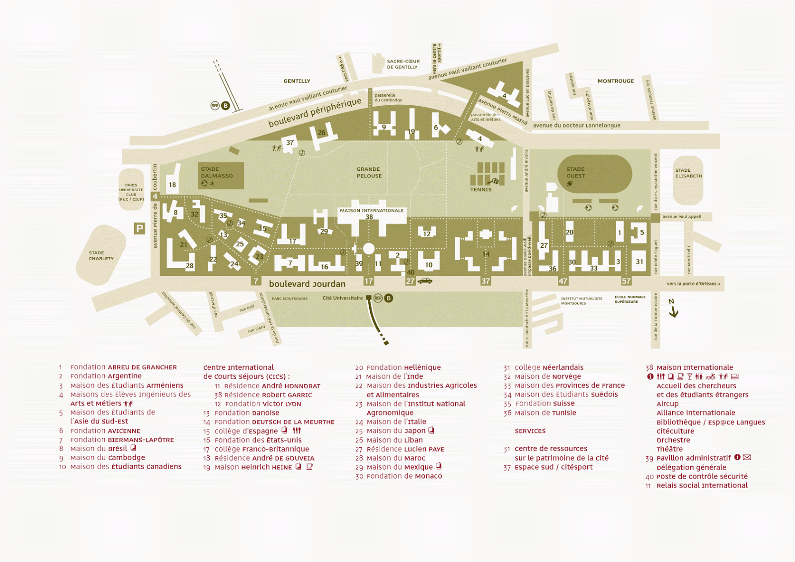 Au-dessus de l’entrée : « Cité Internationale Universitaire » est écrit avec quelques caractères de différents alphabets ; clin d’œil international.